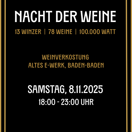 Zusammen mit 13 Winzern aus dem Baden-Badener Rebland präsentiert sich das Baden-Badener Weinhaus am Mauerberg bei der Nacht der Weine im Alten E-Werk in Baden-Baden.